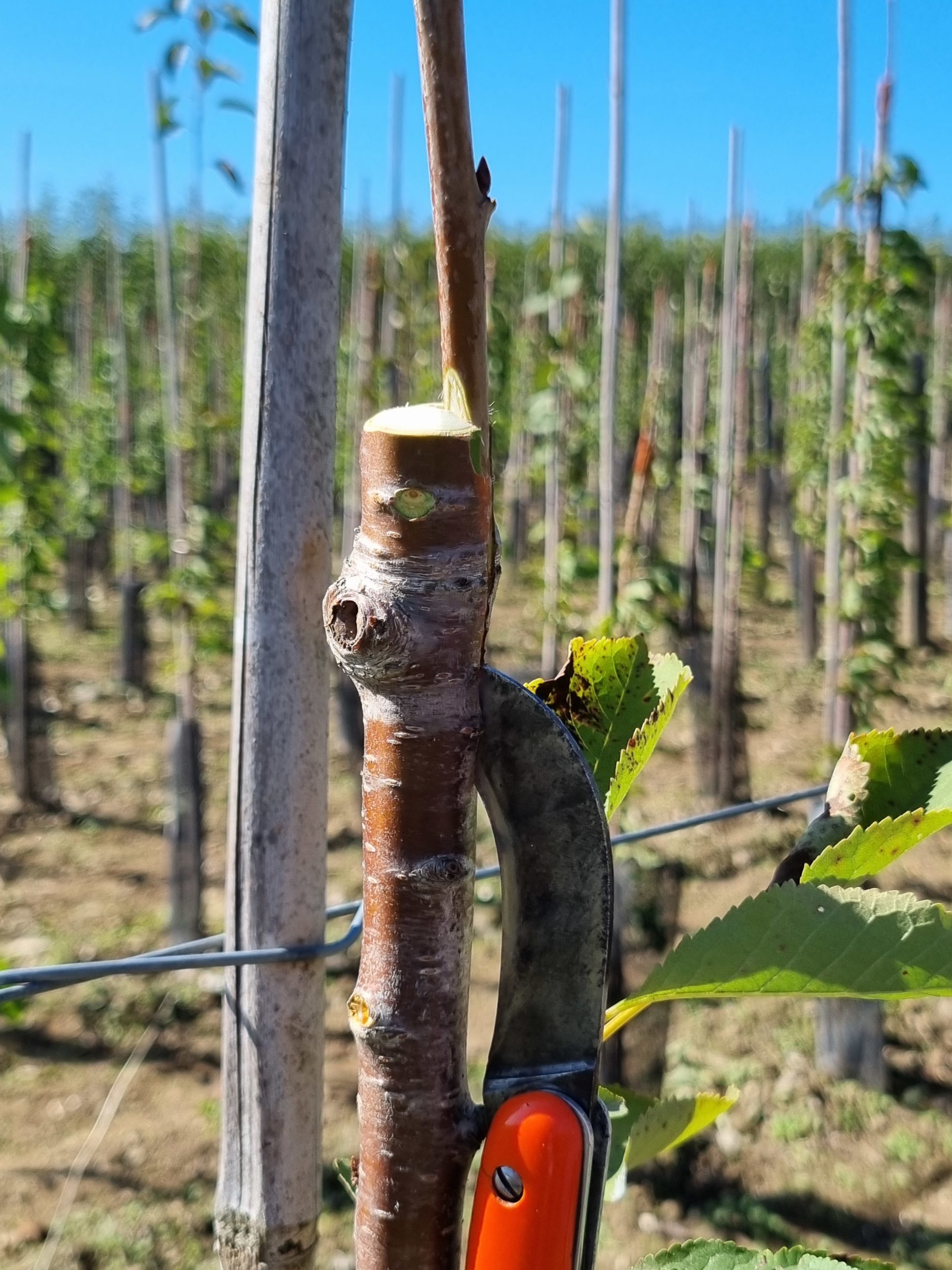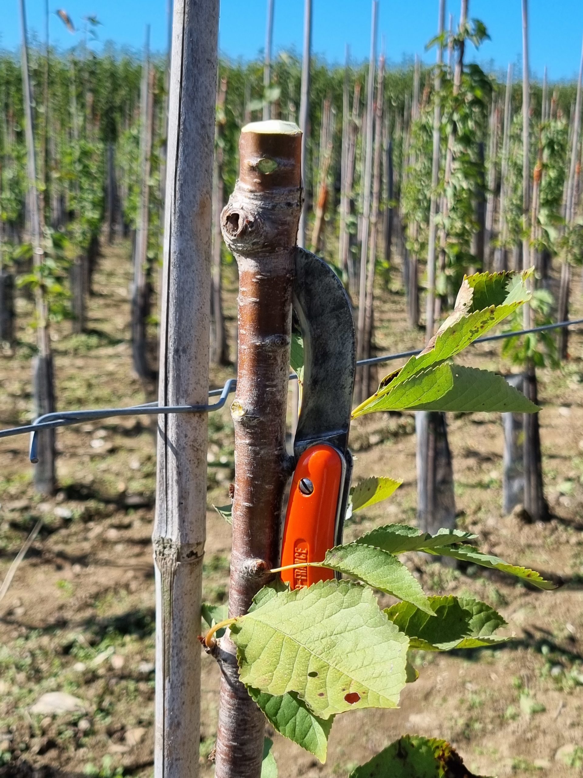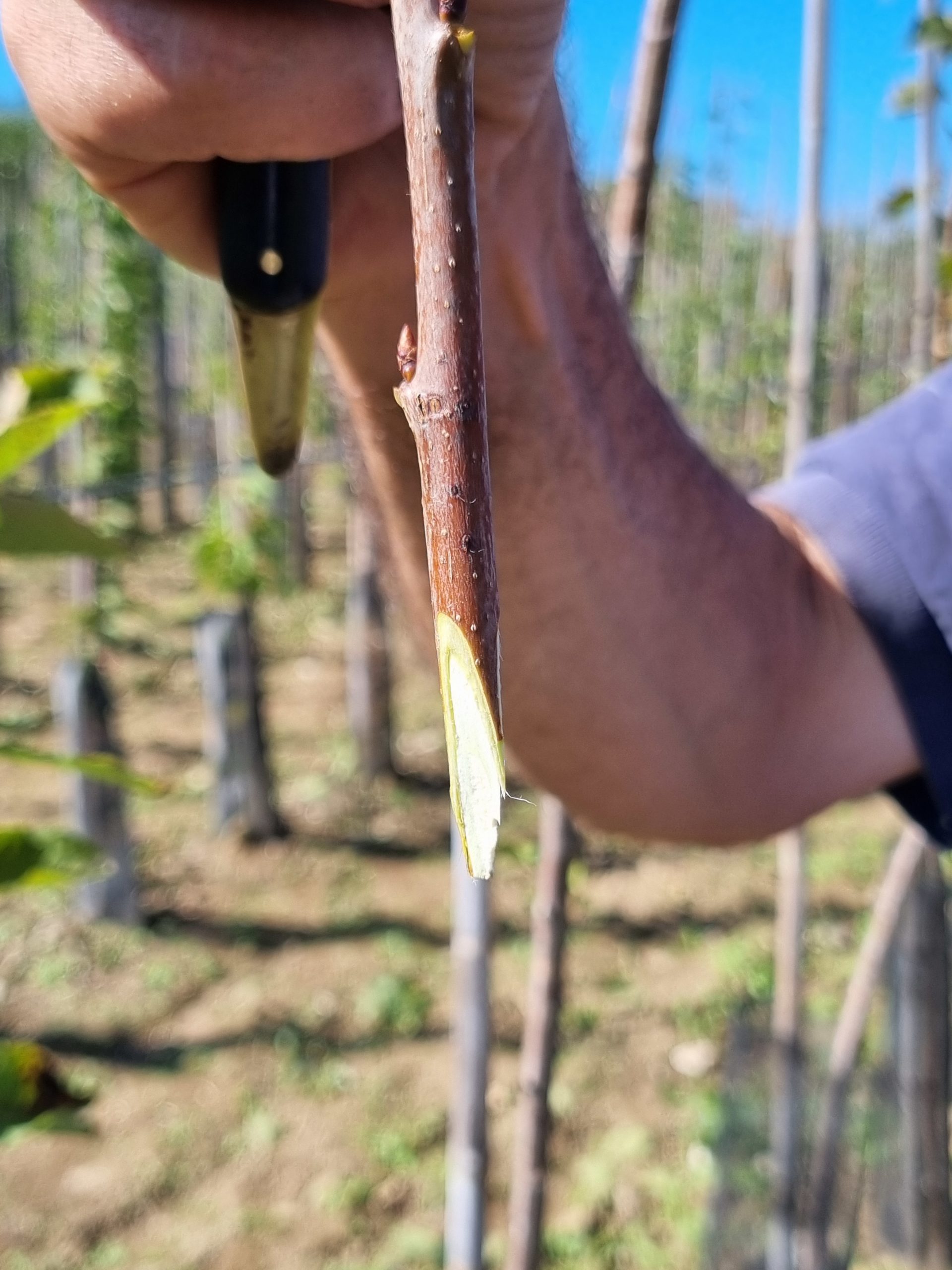Étape 2 : greffage, la méthode variant selon la période de l’année (en écusson à la fin de l’été, ou en incrustation au sortir de l’hiver).